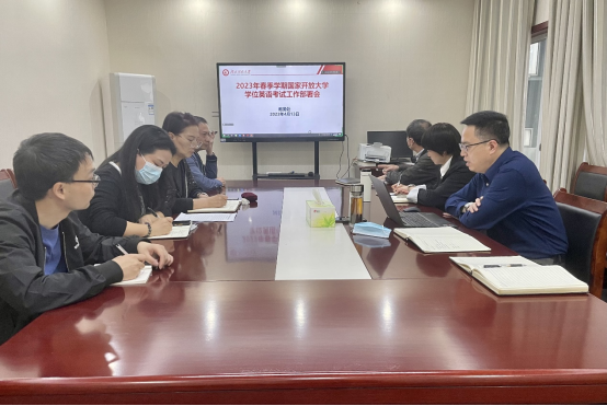 本网讯(通讯员 王李 文/图 )4月13日上午,我校召开2023年春季学期开放教育国家开放大学学位英语考试工作部署会。教务处、导学中心及开放教育学院相关负责人及工作人员参加线下会议,襄阳电大校本部考点、宜昌电大校本部考点主考及相关工作人员共30余人通过腾讯视频会议形式线上参会,会议由教务处长王海洋主持。